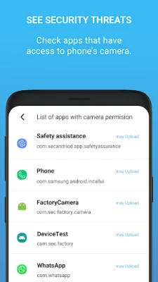 • The app protects your phone's camera from watching and spying you by threats as: viruses, spyware, malware or surveillance apps.