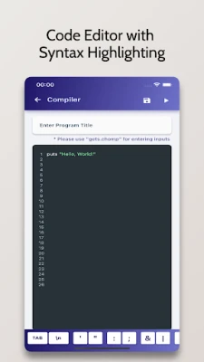 Ruby Compiler is an Advanced IDE enabling you to compile Ruby Programs on your Mobile Phone for Free. It comes with a code editor with in-built syntax highlighting capabilities.