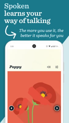 Spoken learns from your speech patterns, offering increasingly accurate next-word predictions as you use it to speak. A quick survey helps it tailor suggestions based on the people and places you talk about most.